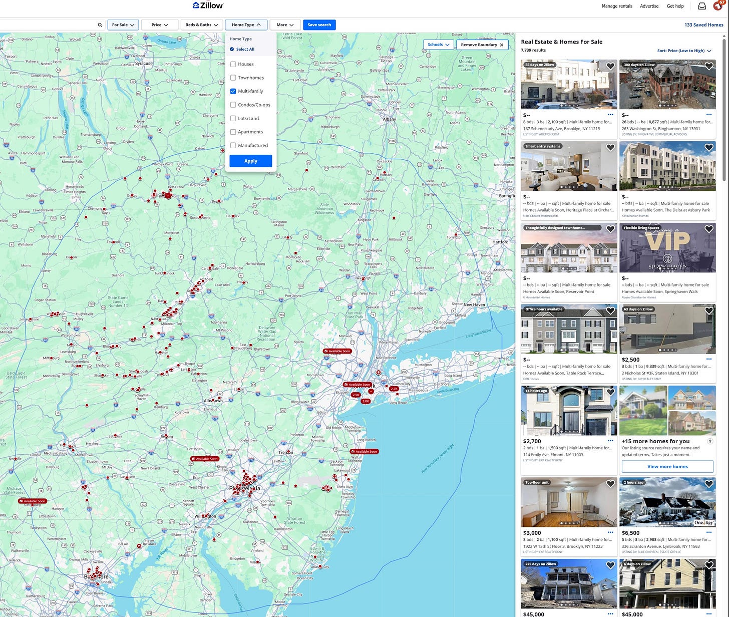 Finding a 7% cap rate property anywhere near New York City is not easy. Investing in expensive neighborhoods where developers are looking to build million‑dollar condos means there is lots of speculative premium in the price. Those who invest in working‑class neighborhoods are operating properties for cash flow, not speculating on the next up‑and‑coming neighborhood. In 2021, that meant looking outside of NYC but close by. This strategy began to come together as we looked through hundreds of real estate listings within about a 250‑mile radius, from nearby Hoboken and Yonkers to the far‑away Lehigh Valley and Syracuse.
